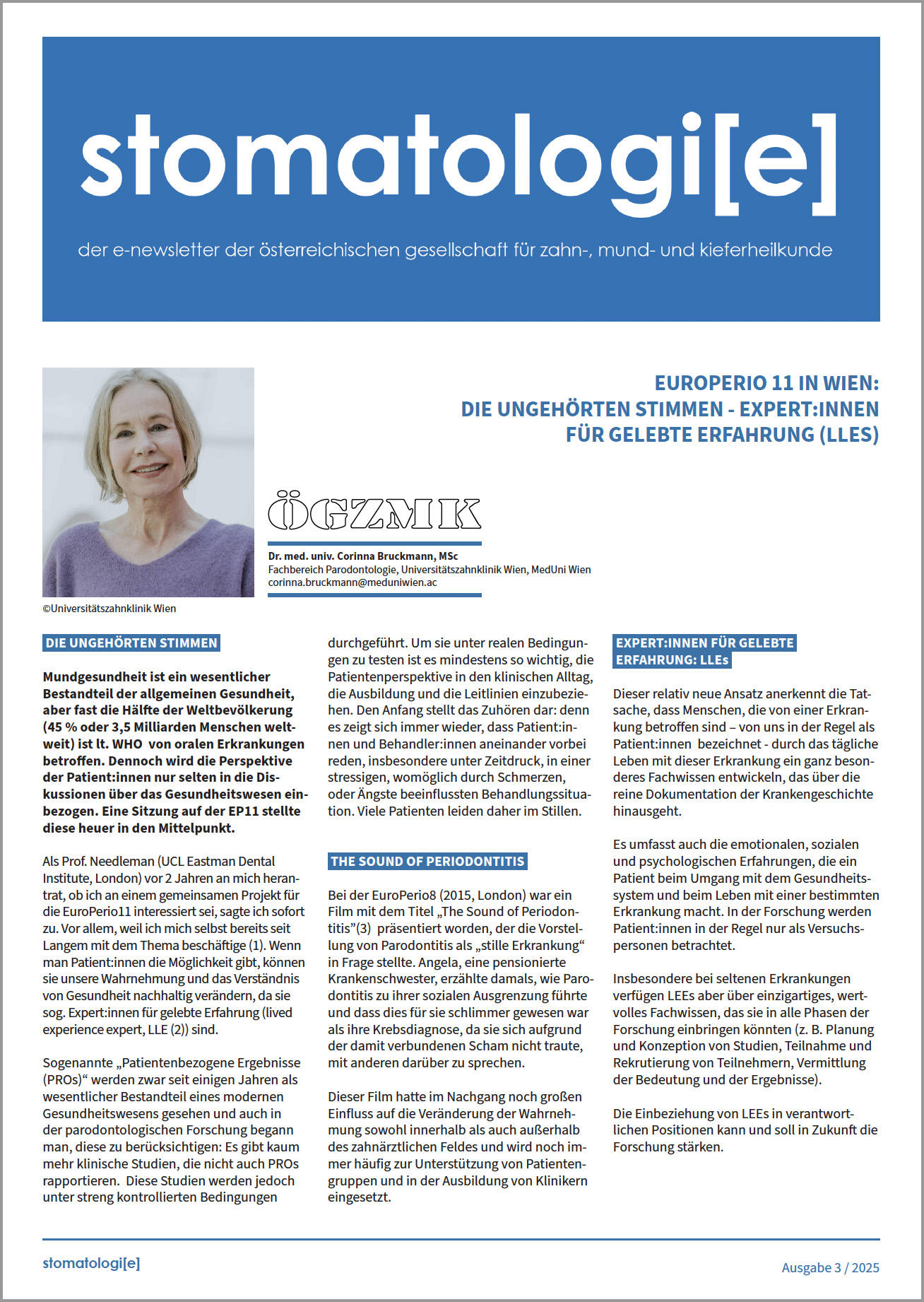 Als Prof. Needleman (UCL Eastman Dental Institute, London) vor 2 Jahren an mich herantrat, ob ich an einem gemeinsamen Projekt für die EuroPerio11 interessiert sei, sagte ich sofort zu. Vor allem, weil ich mich selbst bereits seit Langem mit dem Thema beschäftige (1). Wenn man Patient:innen die Möglichkeit gibt, können sie unsere Wahrnehmung und das Verständnis von Gesundheit nachhaltig verändern, da sie sog. Expert:innen für gelebte Erfahrung (lived experience expert, LLE (2)) sind……