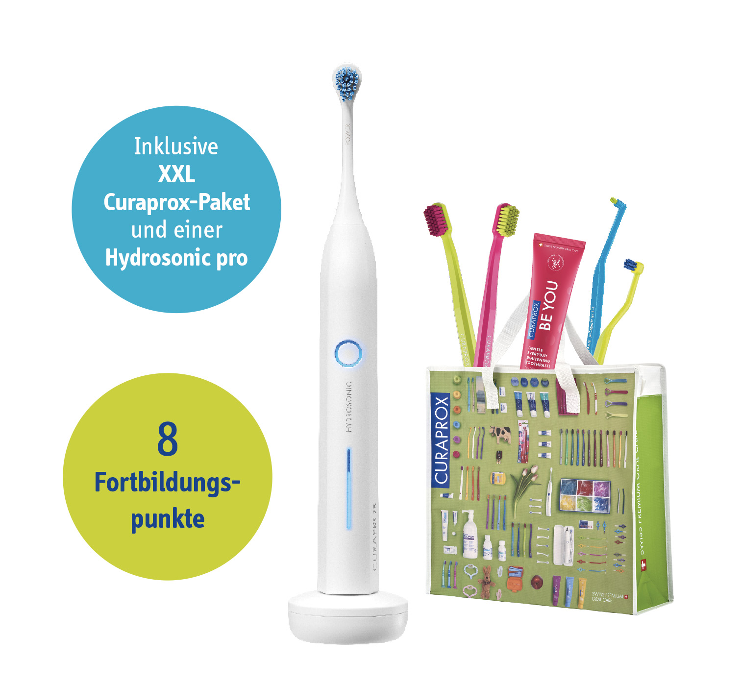 Alle Teilnehmer*innen erhalten ein wertvolles XXL Curaprox „Goodie-Bag“ und eine Hydrosonic pro